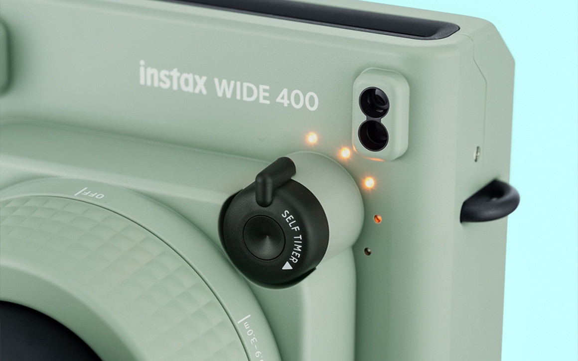 INSTAX WIDE 400 обладает уникальным дизайном, который сочетает в себе ретро-стиль и современную эргономику. Корпус камеры выполнен из прочного пластика, а его размеры составляют приблизительно 162 мм x 98 мм x 123 мм при весе около 616 г. Продуманная форма корпуса со специальным выступом под пальцы обеспечивает удобное и надёжное удержание камеры в руках во время съёмки.