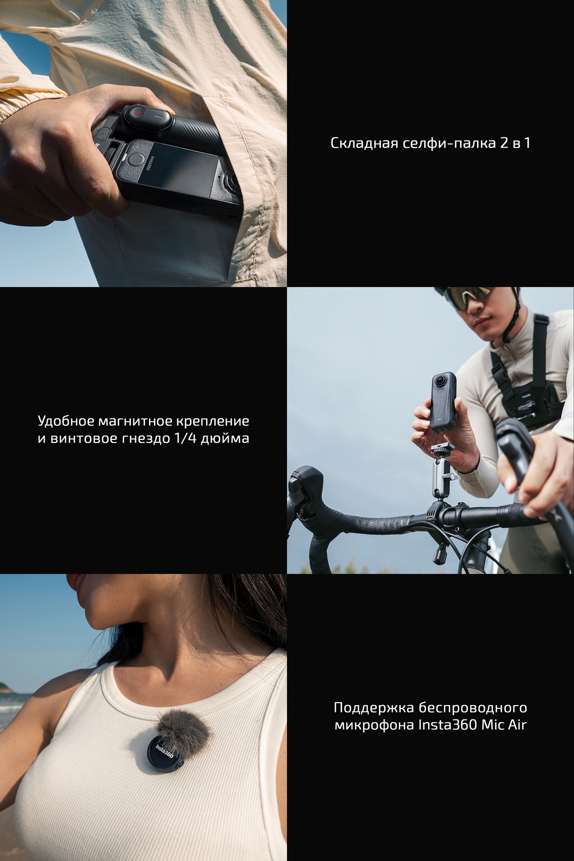 Встроенный ветрозащитный элемент и умные алгоритмы помогает «срезать» поток воздуха, уменьшить окружающий шум, выделив голос, или записать всё как есть, не отсекая посторонние звуки. Если нужен более чистый голос, микрофонный передатчик Insta360 Mic Air (приобретается отдельно) подключается напрямую к камере и обеспечивает стабильный звук на дистанции до 300 метров, оставаясь компактным и незаметным.