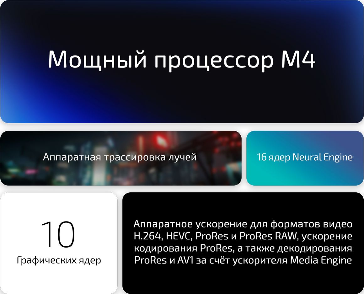 С чипом M4 и его улучшенной встроенной графикой MacBook Air открывает новые возможности для геймеров и профессионалов. Аппаратная трассировка лучей позволяют наслаждаться современными играми на новом уровне качества графики.