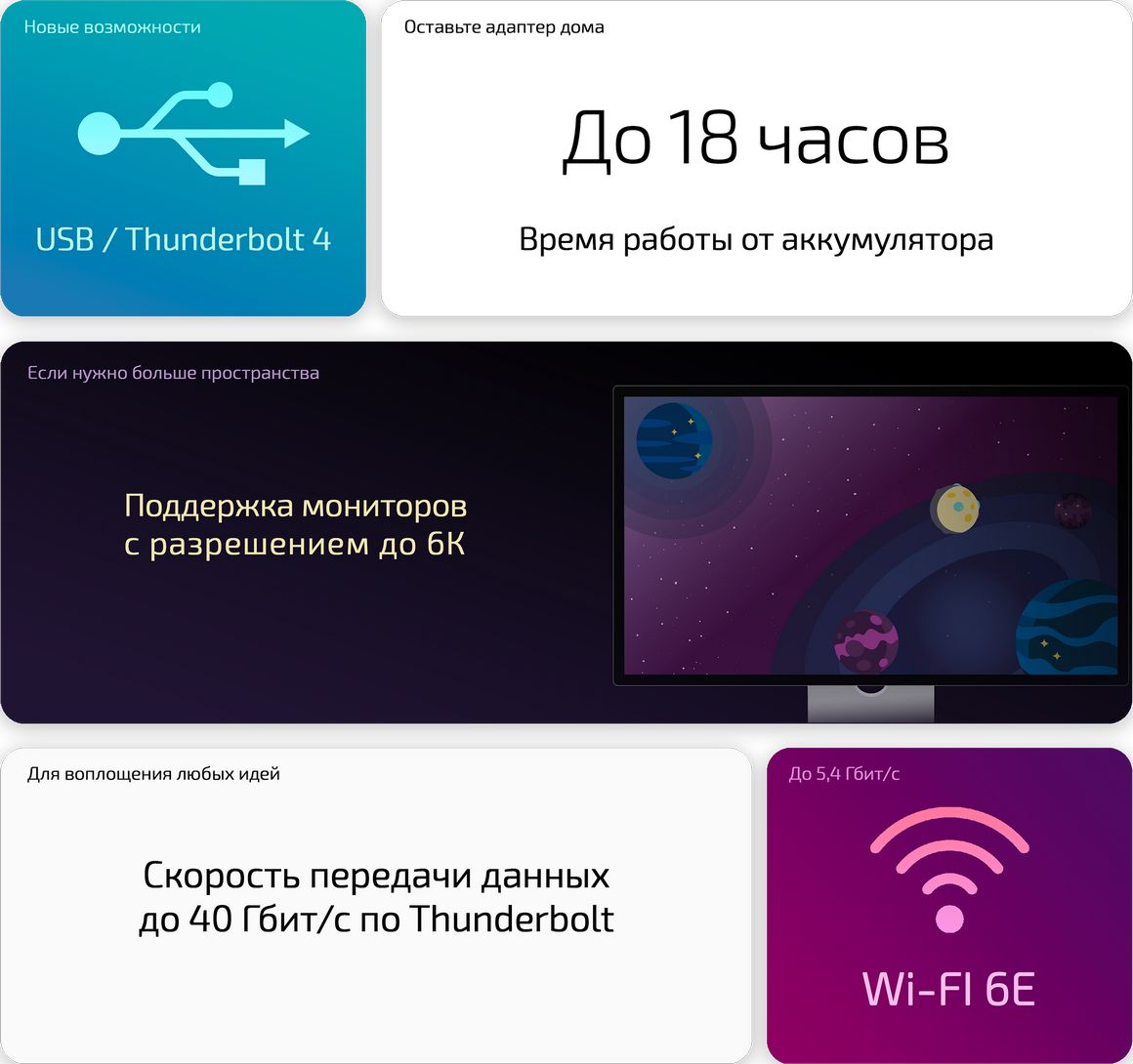 MacBook Air обеспечивает до 18 часов воспроизведения видео и до 15 часов работы в интернете без подзарядки, что позволяет работать и развлекаться весь день.