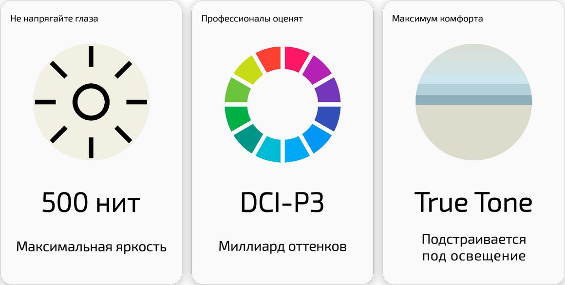 Дисплей Liquid Retina с технологией True Tone обеспечивает яркое и чёткое изображение. Его углы повторяют форму ноутбука, а отступы минимальные. Поддержка широкого цветового охвата (P3) и отображение более миллиарда цветов делают картинку насыщенной и реалистичной.