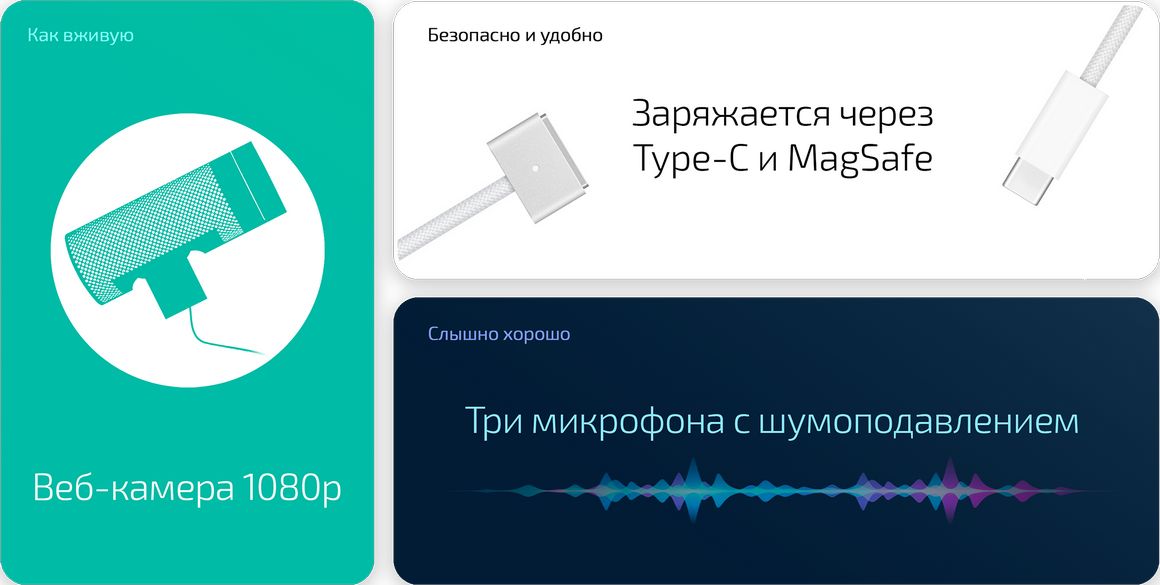 MacBook Air оснащён системой из четырёх динамиков с поддержкой Dolby Atmos и пространственного звучания, обеспечивающих насыщенный и объёмный звук. Для видеозвонков предусмотрена улучшенная 12-мегапиксельная камера с функцией Center Stage.