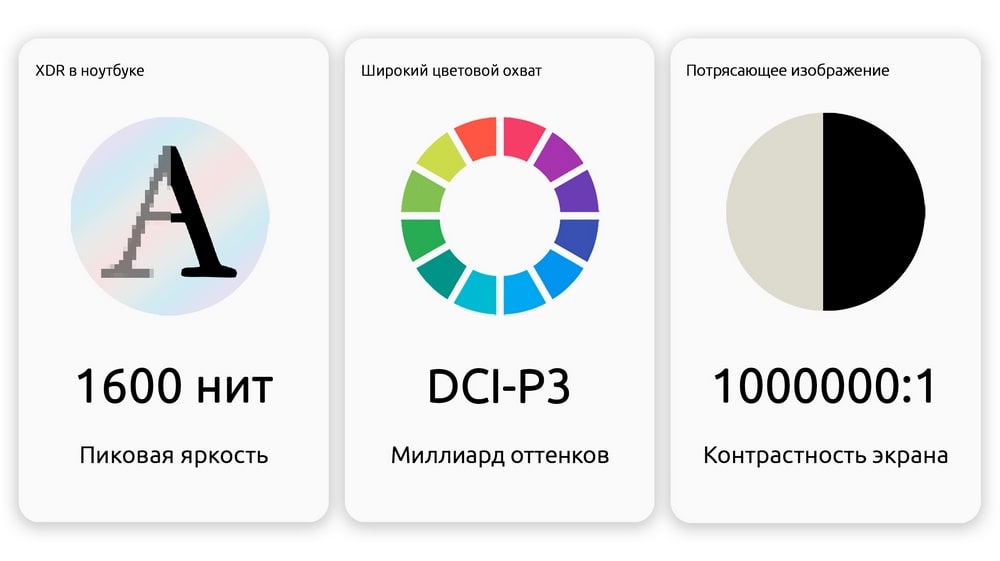 Экран Liquid Retina XDR, не изменившийся в сравнении с предыдущим поколением (2021 года) не перестал быть одним из лучших среди всех ноутбуков: яркость до 1600 нит, контрастность 1000000:1 и миллиарды цветов. Он сделан по технологии технология mini-LED и примечателен поддержкой Pro Motion – с частотой обновления до 120 Гц работа становится комфортнее, а все элементы интерфейса радуют плавностью. Используемые технологии, взятые прямиком из профессионального монитора Apple Pro Display XDR, обеспечивают равномерность подсветки, идеальную цветопередачу и совместимость с HDR, а также поддержку цветового пространства P3.