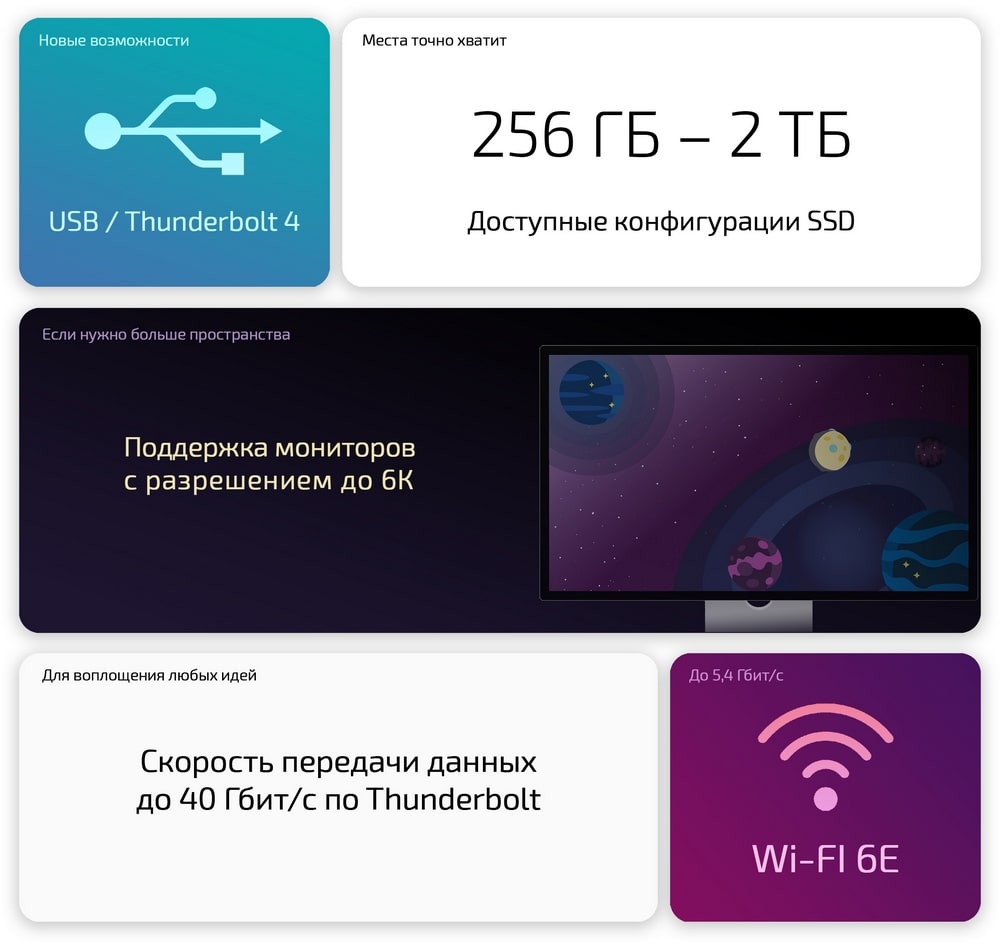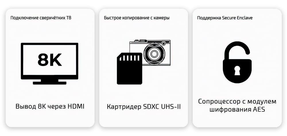 Вы даже можете использовать сразу четыре монитора (6К + 4К) одновременно со встроенным экраном. Максимальная частота обновления для Thunderbolt-мониторов составляет 60 Гц при разрешении 6K, а для HDMI — 60 Гц для 8K и 144 Гц для 4K (в зависимости от подключаемого монитора или ТВ). При использовании нескольких дисплеев одновременно, доступная частота может меняться, в зависимости от их разрешения и количества.