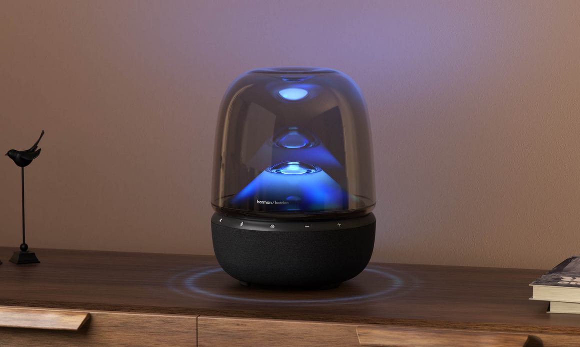 Компания Harman/Kardon представляет акустическую систему Aura Studio 5. Главное новшество — проекционная система подсветки, которая отображает динамические эффекты на стенах или потолке. Пользователю предлагается пять сценариев: «Снежный камин», «Восход солнца», «Цветение», «Аврора» и «Океан». Управлять режимами и яркостью можно через приложение Harman Kardon One.
