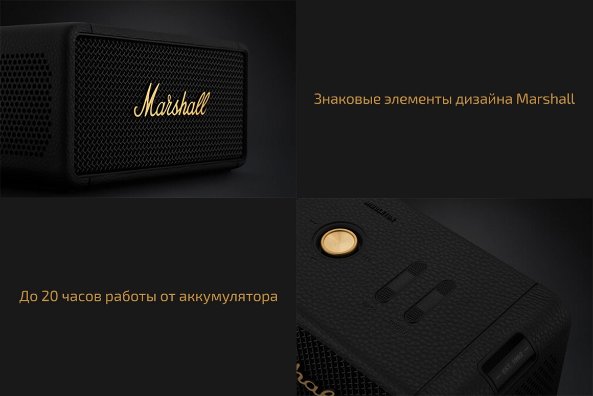 Акустика Marshall Middleton оснащена встроенным аккумулятором, который обеспечивает до 20 часов непрерывного воспроизведения музыки. Быстрая зарядка позволяет восстановить заряд до 50% всего за 20 минут, а полная зарядка займет 4,5 часа.