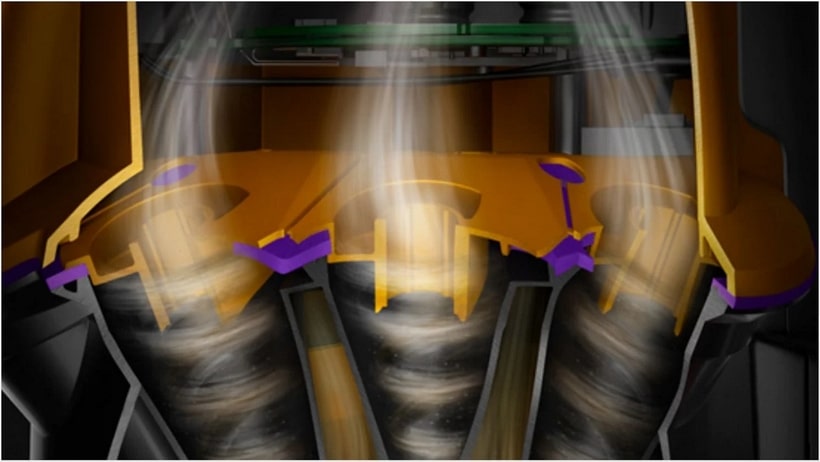 14 циклонов создают силы мощностью до 100 000 g для улавливания пыли и мусора из воздушного потока без потери мощности всасывания.