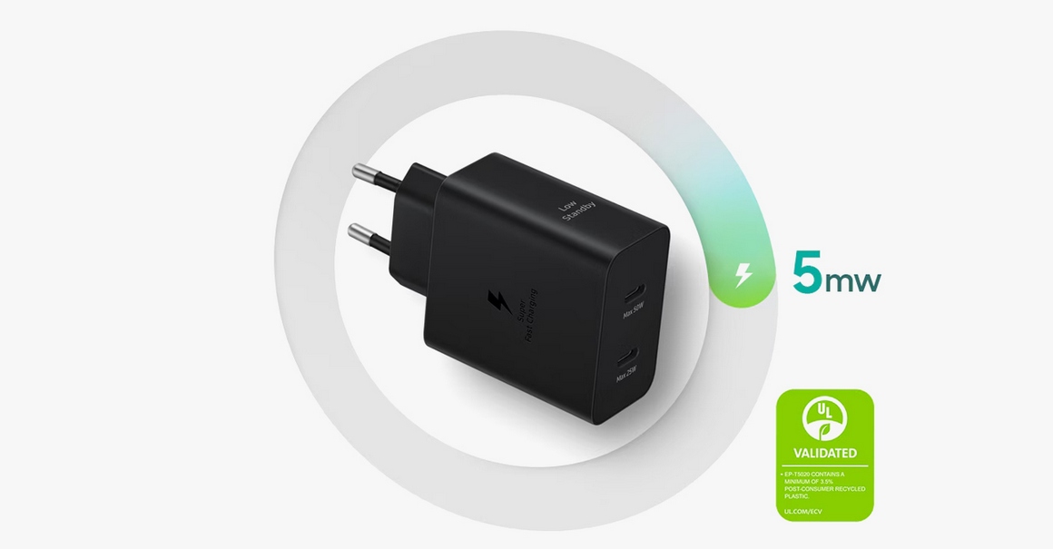 Благодаря малому энергопотреблению в режиме ожидания адаптер 50 Вт позволяет экономить электроэнергию без ущерба для производительности. С его помощью ваши устройства Galaxy будут готовы к следующему творческому процессу или деловой встрече.