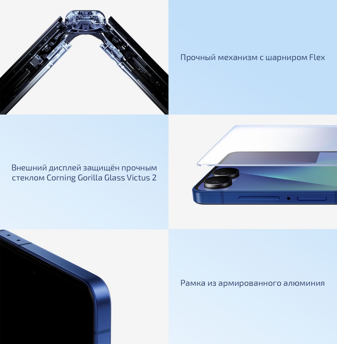 Помимо увеличенного внешнего и внутреннего экранов, смартфон получил более лёгкий и прочный шарнир Flex. Передняя и задняя наружные части защищены стёклами Gorilla Glass Victus 2 от Corning, а класс защиты IP48 означает защиту от пыли и воды, причём смартфон можнт провести полчаса на глубине до полутора метров. Рамка корпуса сделана из армированного алюминия, поэтому Z Flip7 не только приятно держать в руках – он ещё и очень прочный, несмотря на раскладной форм-фактор.