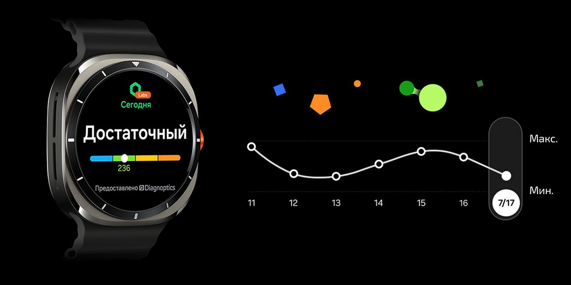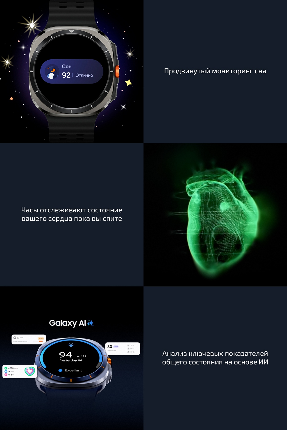 Стать суперспортсменом и выдержать горный сверхмарафон без подготовки не получится. Galaxy Watch Ultra помогут плавно подготовиться: поддерживают множество спортивных режимов и дают точные рекомендации. Прокачаны и функции анализа здоровья, включая несколько новых показателей.