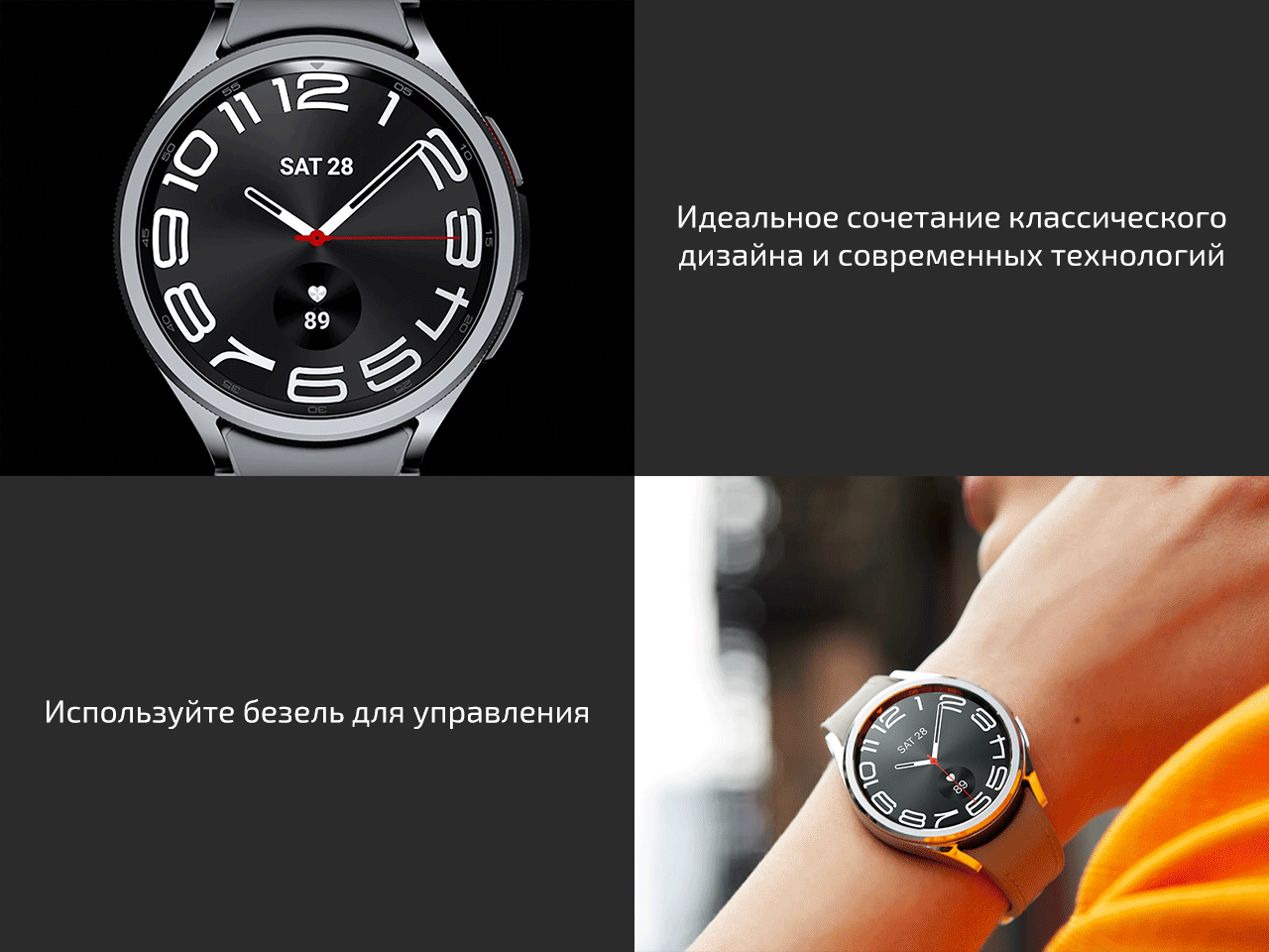 Стильный дизайн, вдохновлённый классическими часами. Премиальные материалы. Большой и яркий дисплей. Samsung Galaxy Watch6 Classic представляют собой идеальное сочетание проверенного десятилетиями стиля и современных возможностей. Модели шестого поколения получили тонкий безель, мощный процессор и отличный экран, а также массу новых программных улучшений, чтобы следить за своим телом и повседневными делами прямо с запястья руки было ещё проще и удобнее.