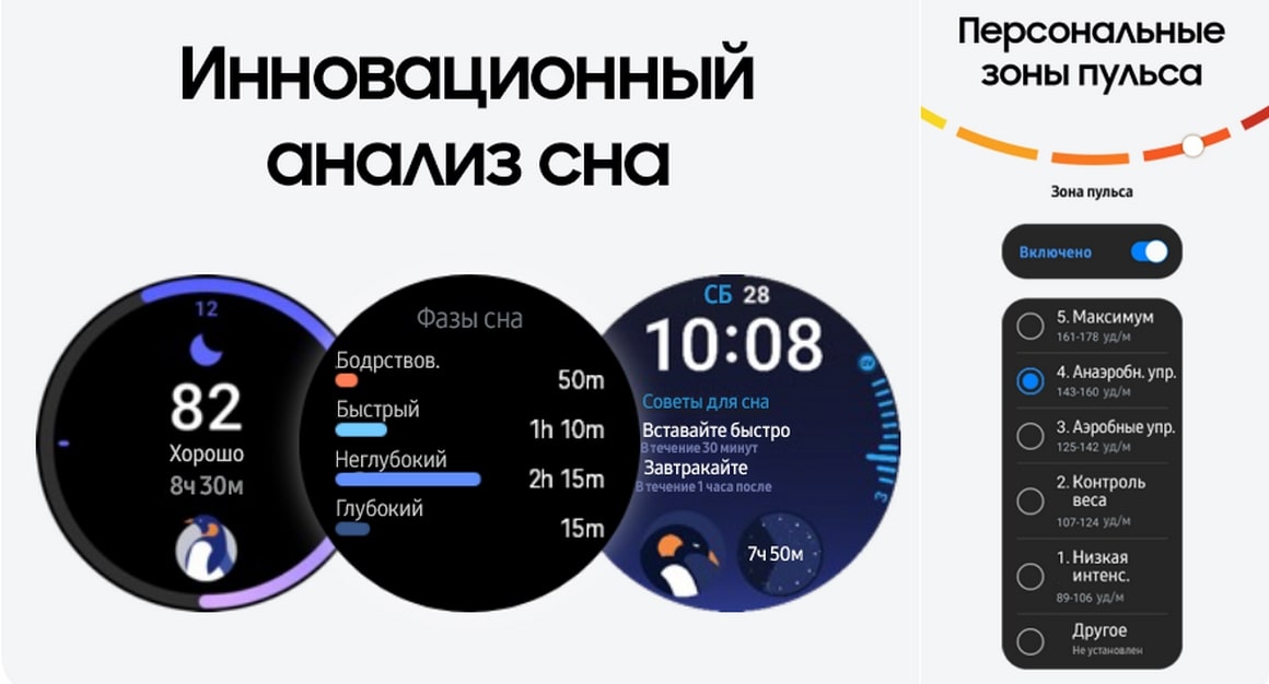 Часы могут анализировать состав тела, мониторить ЧСС и даже имеют функцию отслеживания цикла. Настроив оптимальную зону ЧСС, вы сможете тренироваться без риска для сердца, ведь Galaxy Watch6 Classic будут уведомлять вас о нахождении в оптимальной зоне, которая настраивается индивидуально. А более детальную информацию о вашем здоровье всегда можно посмотреть в приложении Samsung Health.